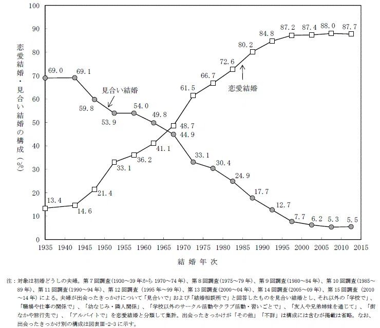 国立社会保障・人口問題研究所によると、1940年代前半までは見合い結婚が約7割。